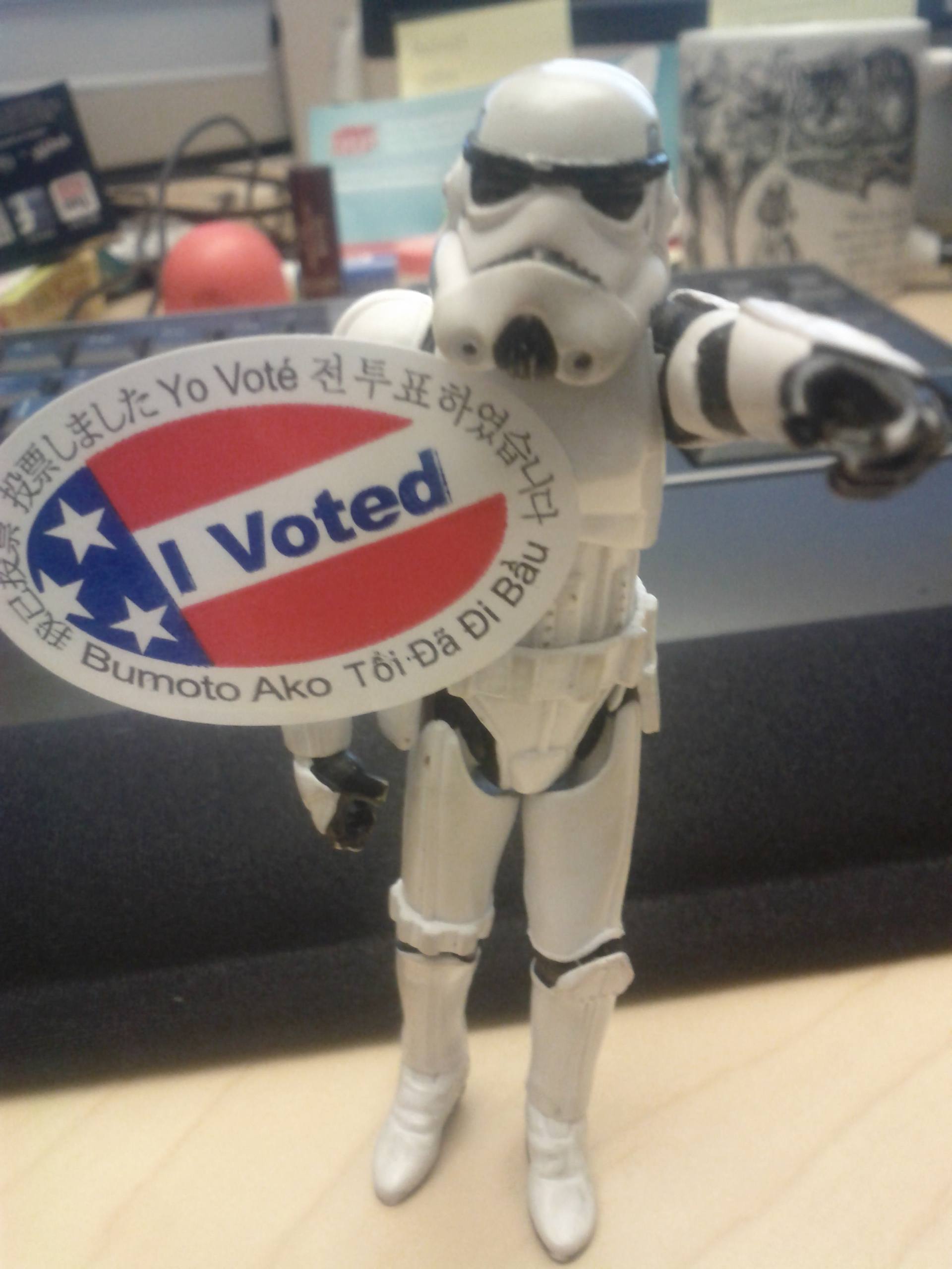 November 6, 2012Politics Leave a comment Election Day ’12 Stormy voted in his galaxy, far, far away. Have YOU? Share this: Click to share on X (Opens in new window) X Click to share on Facebook (Opens in new window) Facebook Like Loading... Related Election DaypoliticsVoting